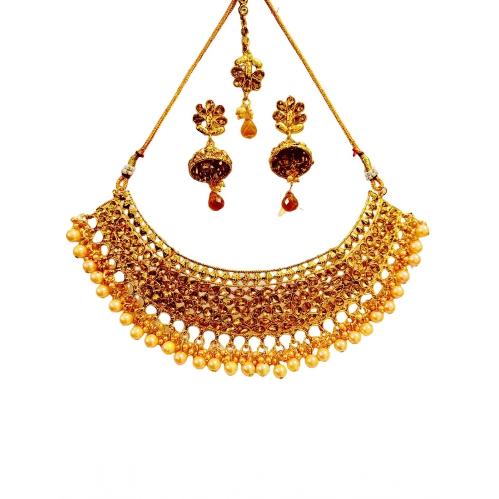 Women’s Rose Gold Plated Alloy Necklace Earrings With Maangtika Set